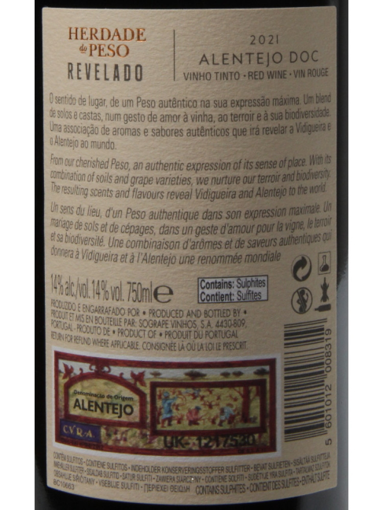 O Vinho Herdae do Peso Revelado Tinto é de cor vermelha viva, aroma atrativo com notas de fruta preta e uma componente de especiarias presente. Na boca é fresco, muito completo e elegante, têm taninos presentes e finos, muito bem integrados.